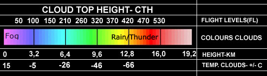 CLOUD TOP HEIGHT- CTH - HEIGHT OF THE TOP OF THE CLOUDS-UPDATED HOURLY Specially developed for pilots, mountaineers, divers,sailors,etc. Also accurate indication possibility of rain- clouds above 10km(yellow and red)- high possibility of rain- also fog(purple colour). CLICK HERE FOR FULL DISC- WORLD CTH FOG= |